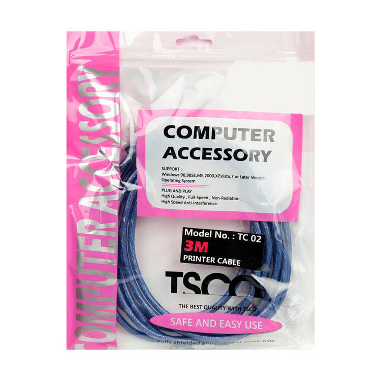 کابل پرینتر TSCO TC02 3m دارای کیفیت مناسب رویه کابل و سیم های درونی با کیفیت است. کابل پرینتر تسکو مدل TC02 با انواع سیستم عامل های ویندوز 98,98SE, ME, 2000, XP, vista, 7 and later version ارتباط برقرار می کند. جنس رویه کابل کنفی است که روی آن هم یک لایه ضخیم و شفاف پلاستیک نرم TPE کشیده شده است. از کابل پرینتر TSCO TC02 با طول 3 متری خود، به راحتی می توانید برای اتصالات با فاصله نسبتا زیاد کامپیوتر و چاپگر استفاده کنید.