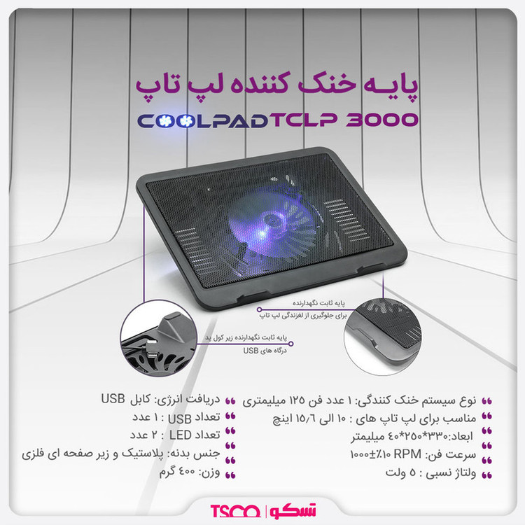 کاربرانی که استفاده مداوم و زیادی از لپتاپهای خود دارند؛ معمولاً از وسایل جانبی متعددی استفاده میکنند تا سرعت و کیفیت کارشان بالا برود. معمولاً لپتاپها در اثر استفاده بیش از حد اصطلاحاً داغ میکنند و فن آنها برای خنکسازی سیستمهای درونی همچون موتور تراکتور شروع به کار میکند و صدای عجیبی از آنها بلند میشود. زمانی که دمای درونی لپتاپ متعادل باشد سرعت اجرا و عملکرد برنامههای لپتاپ نیز به خوبی پیش میرود. به همین دلیل کاربران پرمصرف بایستی از وسایلی برای خنکسازی لپتاپ خود استفاده کنند تا مجبور به خرید زودهنگام و مجدد لپتاپ جدیدی نشوند. یکی از وسایل بسیار مرسوم برای خنکسازی سیستمها، پایههای خنککننده یا کول پد است. پایه خنک کننده تسکو مدل TCLP 3000 برای لپتاپهایی تا 17 اینچ مناسب است و از ترکیبات فلز و پلاستیک ساخته شده است. سیستم خنککنندگی این محصول به وسیله 1 عدد فن 120 میلیمتری انجام میشود و سرعت فن آن 1000 دور بر دقیقه است. همچنین نحوه دریافت انرژی از طریق درگاه USB لپتاپ صورت میگیرد.