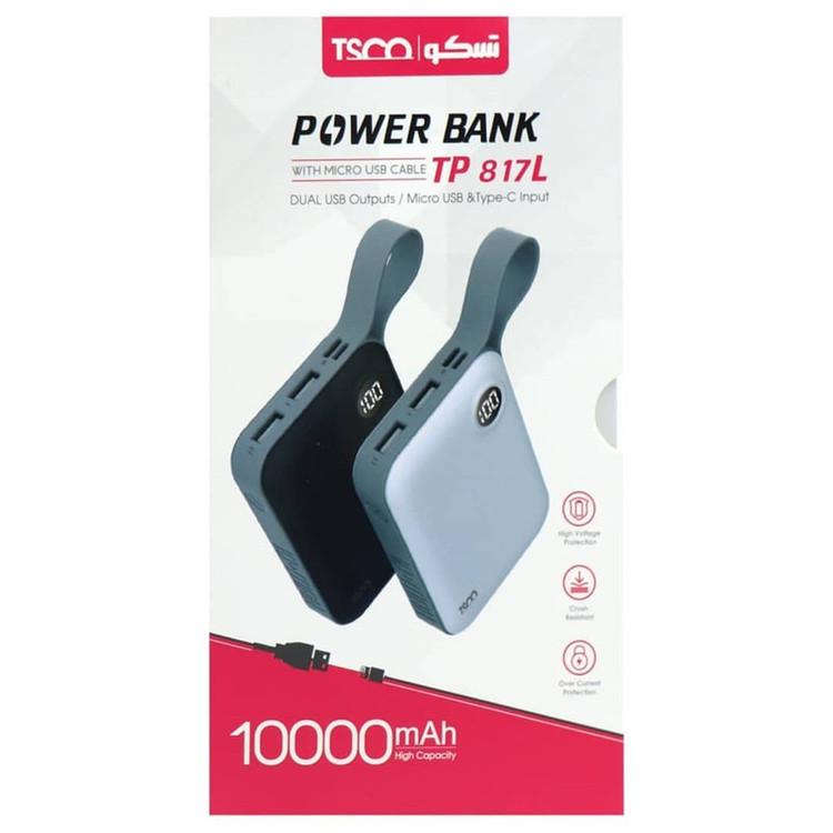 مدل TP 817L محصولی از برند تسکو است که ظرفیت اسمی 10000 میلیآمپرساعتی دارد و ابعاد کوچک و جمعوجور آن، این محصول را برای کاربرانی مناسب ساخت است که به دنبال شارژری سبک و جمع و جور هستند. این شارژر همراه با وزن 202 گرمی و با ابعاد 100 در 72 میلیمتر و ضخامت حدودا 24 میلیمتر، حمل سادهای دارد و فضای زیادی را در کیفتان اشغال نمیکند. بر روی این پاوربانک 4 پورت در گوشه بالا و یک بند برای راحتی حمل دیده می شود. پاوربانک TP 817Lدارای دو پورت خروجی USB با شدت جریان 2.1 آمپر است. خود این شارژر همراه ، هم از طریق درگاه Micro-USB و هم یک درگاه ورودی از نوع USB Type-C شارژ میشود و به همین دلیل این پروسه سرعت بالایی دارد.